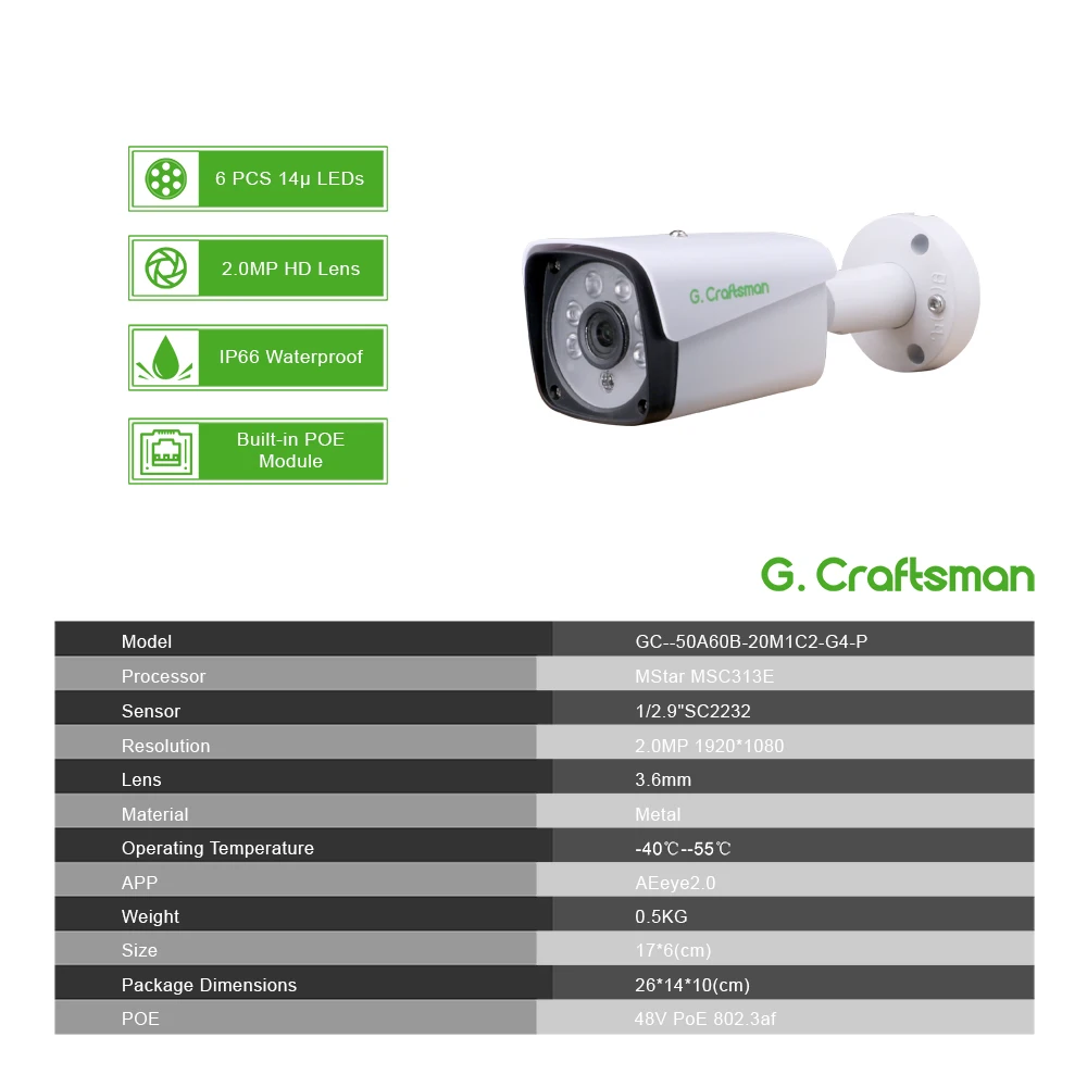 G.Craftsman 1080P POE Full-HD IP Camera 2MP Outdoor Waterproof Infrared Night Vision Onvif 2.6 CCTV